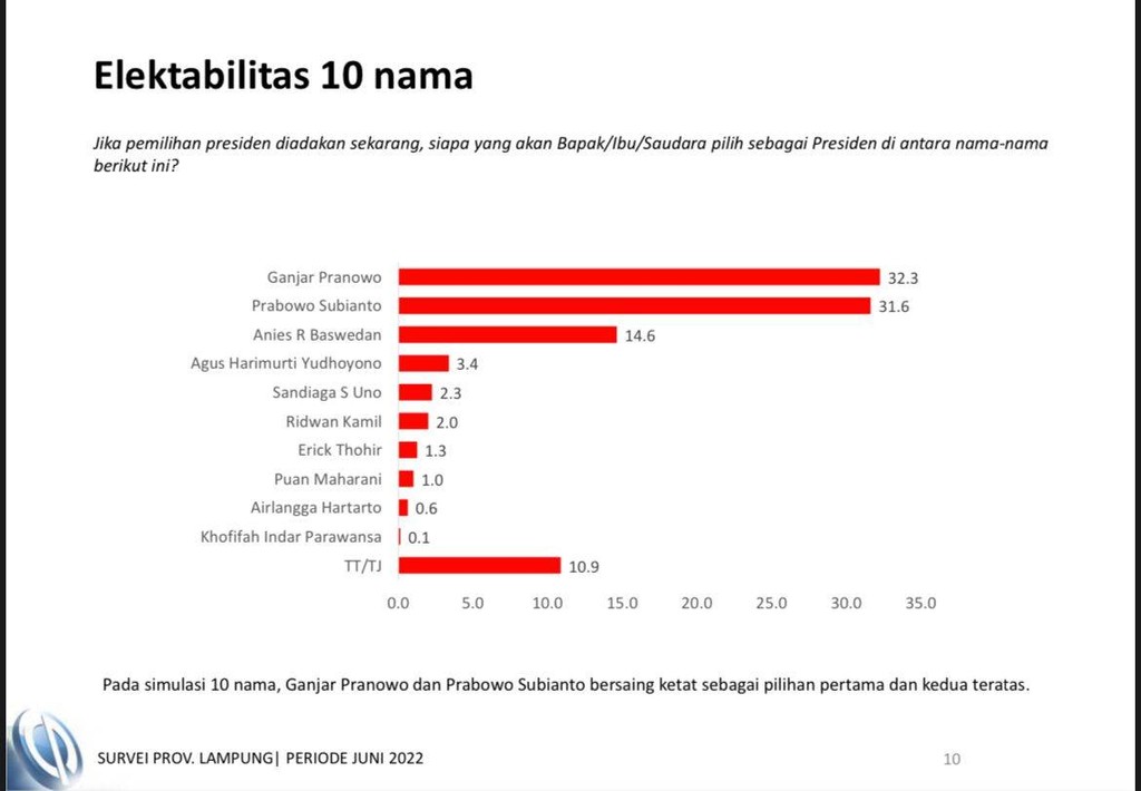 Direktur Eksekutif Charta Politika Yunarto mengatakan, Ganjar memperoleh angka elektabilitas 32,3 persen di Lampung. Disusul Menhan Prabowo Subianto (31,6 persen) dan Gubernur DKI Jakarta Anies Baswedan (14,6 persen).
