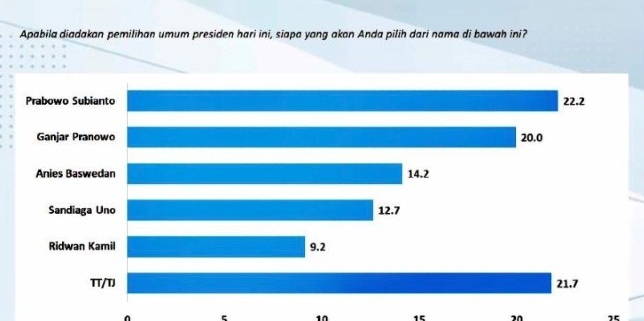 ”Namun di Jawa Barat, Ganjar Pranowo memperoleh 12 persen. Artinya mampu menyaingi tiga kandidat lain seperti Prabowo Subianto 24.0 persen, Ridwan Kamil 20,9 persen, lalu Anies Baswedan 18 persen,” papar Yunarto.