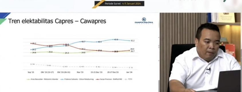 Liputan6.com, Jakarta – Lembaga Charta Politika Indonesia merilis hasil survei terbaru elektabilitas calon presiden (capres) dan calon wakil presiden (cawapres) pada Minggu (21/1/2024).