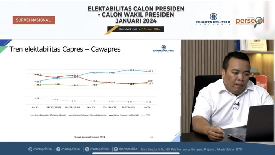 Sebagai informasi, survei yang diselenggarakan oleh Charta Politika dilakukan pada 26-31 Oktober 2023 terhadap 2.400 responden yang tersebar di seluruh Indonesia.