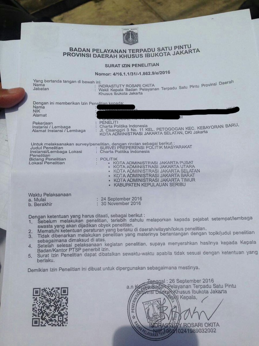5.Kegiatan Survei yang kami lakukan dibekali izin resmi Kemendagri Pusat & Badan Pelayanan Terpadu Satu Pintu (BPTSP) DKI Jakarta.