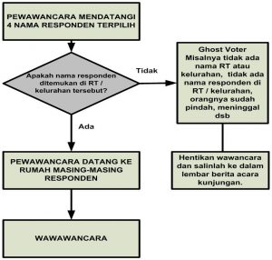 Pewawancara mendatangi nama-nama responden yang menggunakan hak pilihnya tersebut. Perlu dicatat, ada dua kemungkinan ketika pewawancara mencari atau mendatangi nama-nama responden yang tidak menggunakan hak pilihnya. Pertama, nama tidak ditemukan atau tidak ada di kelurahan tersebut (disebut sebagai ghost voters). Jika ini yang terjadi, maka wawancara dihentikan. Kedua, nama responden ada di kelurahan. Jika ini yang terjadi, pewawancara mencari responden tersebut dan melakukan wawancara.