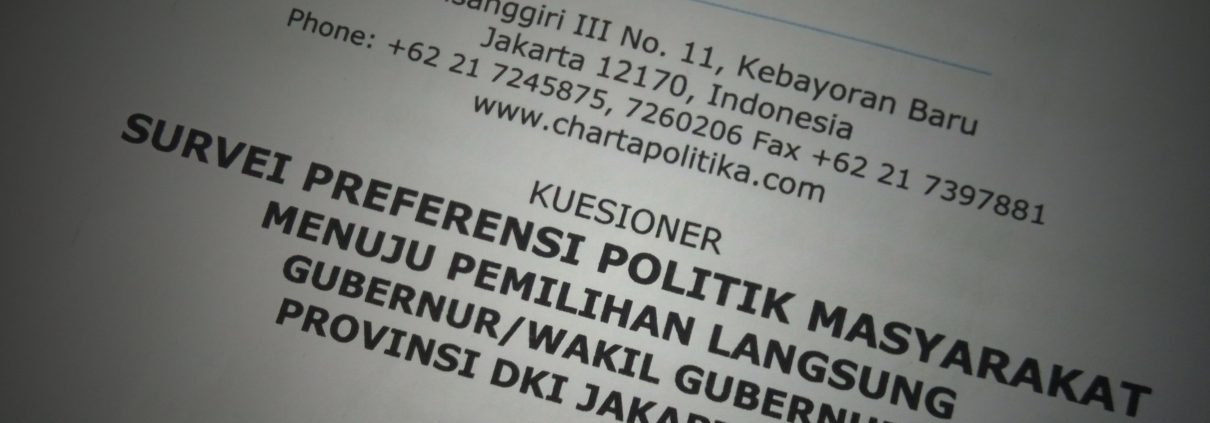 /0 Comments/in Rilis SurveiCharta Politika Indonesia menyelenggarakan survei preferensi politik masyarakat DKI Jakarta menjelang pemilihan Gubernur dan Wakil Gubernur DKI Jakarta periode 2017-2022. Pengumpulan data dilakukan pada 17–24 November 2016 melalui wawancara tatap muka dengan menggunakan kuesioner terstruktur.
