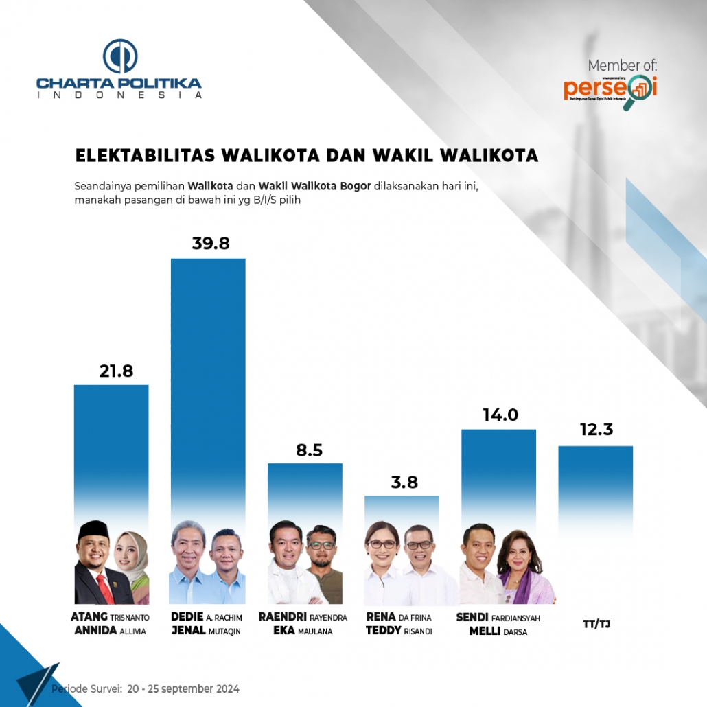 Charta Politika Indonesia adalah lembaga penelitian kebijakan dan opini publik, menyelenggarakan survei di Kota Bogor pada tanggal 20 – 25 September 2024, melalui wawancara tatap muka secara langsung dengan menggunakan kuesioner terstruktur. Jumlah sampel sebanyak 400 responden, yang tersebar di 6 Kecamatan di Kota Bogor. Metodologi yang digunakan adalah metode acak bertingkat (multistage random sampling) dengan margin of error ±