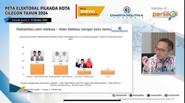 Direktur Eksekutif Charta Politika Yunarto Wijaya merinci pasangan Robinsar-Fajar memperoleh 38,7 persen. Disusul oleh paslon nomor dua Helldy Agustian-Allawi Mahmud 33,6 persen.